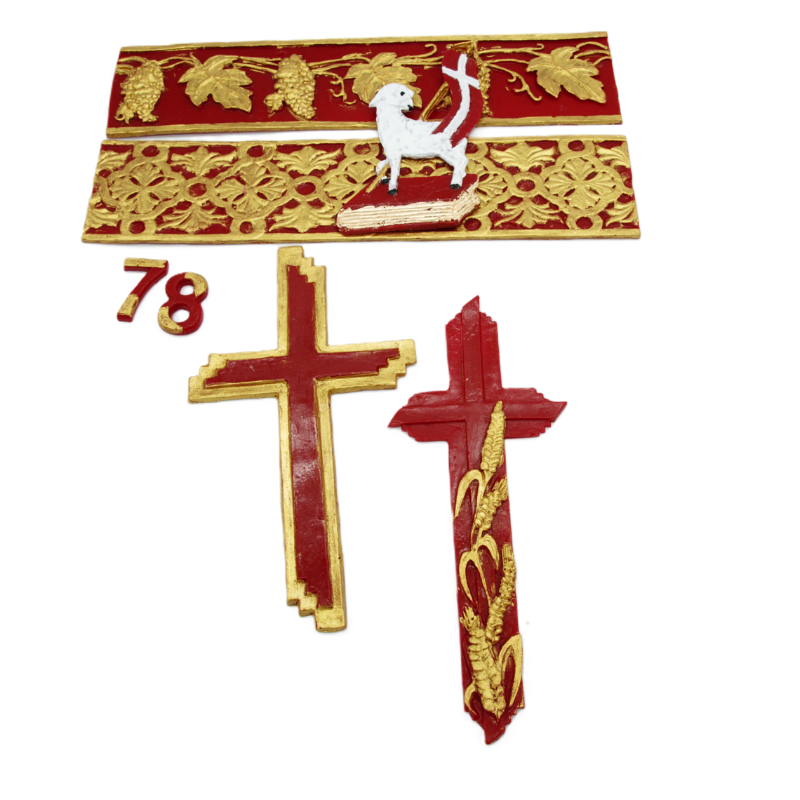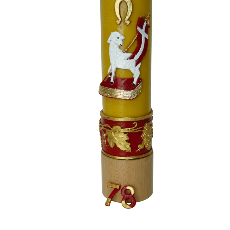 Świeca symbolizująca Zmartwychwstałego Chrystusa. Wykonana ją w 100% z czystego wosku pszczelego. Elementy zdobnicze odlano ręcznie jak i całą świecę. Okuta jest drewnianym cylindrem z drewna bukowego.