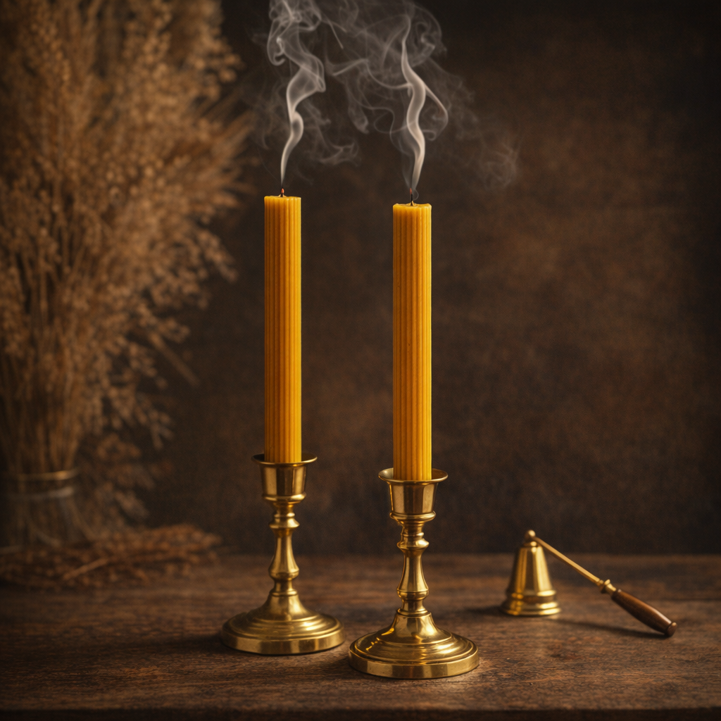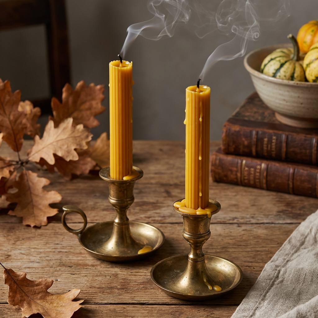 Finezyjny wygląd świecy woskowej. Piękna prezencja w lichtarzu. Ten zapach spalanego wosku, sprzyja romantycznemu nastrojowi.