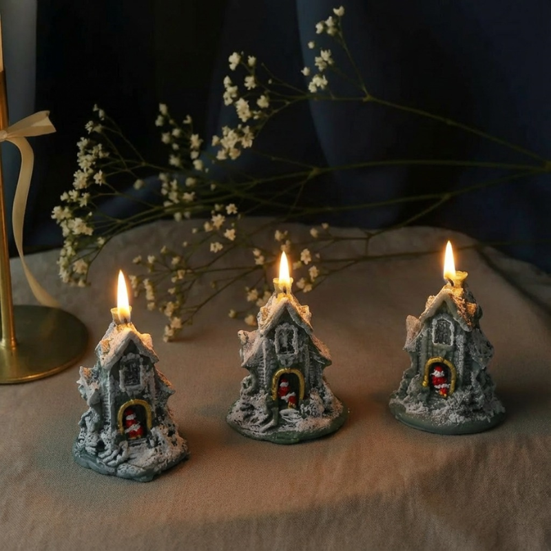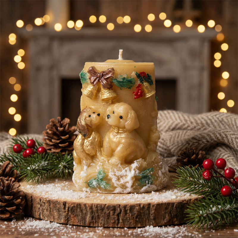 Świeca z wosku pszczelego z dodatkiem wosku sojowego, barwiona w masie. Ręcznie malowana, pokryta imitacją śniegu. Może stanowić ozdobę świąteczną.